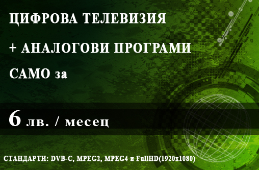 ВИСОКОСКОРОСТЕН ОПТИЧЕН ИНТЕРНЕТ и ЦИФРОВА DVB-C, MPEG2, MPEG4 и FULLHDтелевизия + аналогови програмиСАМО за 6 лв. / месецЗА КОНТАКТИ052 960 100, 052 60 40 30 - кол център ВАРНА 0579 96 100, 0579 750 24 - кол център БАЛЧИК 088 4 00 45 00 --------------------------------------------------------- |